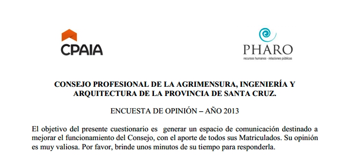 La encuesta puede ser descargada desde nuestro sitio web y una vez completada entregada en la Sede Central del CPAIA en Rio Gallegos y en sus delegaciones o enviandola por correo electronico a cpaia@infovia.com.ar