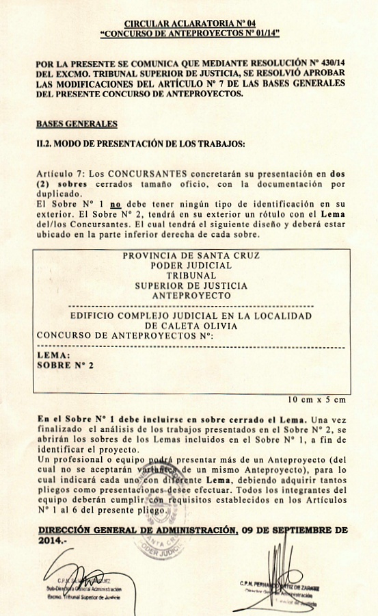 Circular aclaratoria n° 4 del Concurso de Anteproyectos N° 01/14 del Poder Judicial de la Provincia de Santa Cruz. La misma establece el modo de presentación de los trabajos.