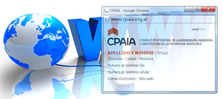 Complete la información de contacto y envíela por correo electrónico con el titulo "Datos Matriculado" a cpaia@cpaia.com.ar - Solo complete los datos que desea que figuren en el sitio web.