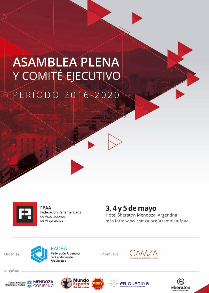 FADEA (Federación Argentina de Entidades de Arquitectos), en representación de la Federación Panamericana de Asociaciones de Arquitectos (FPAA), tiene el agrado de convocarlo a participar de la reunión del Comité Ejecutivo y Asamblea Plena de la FPAA que se realizará en la Ciudad de Mendoza - Argentina, durante los días 03, 04 y 05 de mayo de 2017.